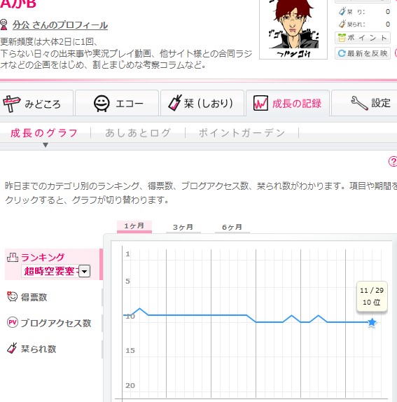 それにこのカテゴリマスターの決め方もよくわからなくて、このblogramに表示されるアクセス数とか、同じblogramユーザーからもらえる「栞る」とかいう制度の得票数も、ほぼ0になっている分公が10位に選ばれるのだろうか。